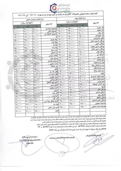 همچنین قیمت انواع میوه، سبزی و صیفی جات در میدان مرکزی میوه و تره بار به شرح جدول ذیل است: