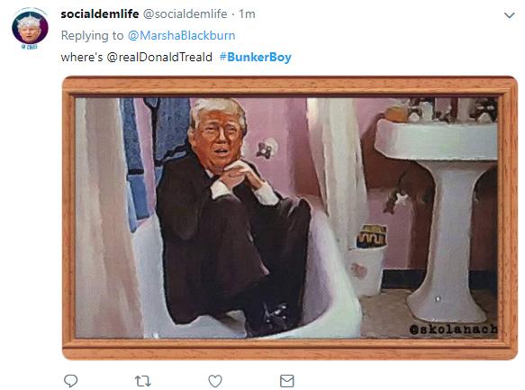 یکی از کاربران میگوید «پادشاه ترسو از داخل مخفیگاه خود حکومت میکند وقتی که آمریکا در آتش میسوزد.» یک کاربر دیگر نوشت «آیا رفتار ترامپ که در مخفیگاه مخفی شد و چراغهای کاخ سفید را روشن کرد، بزدلانه نیست؟»