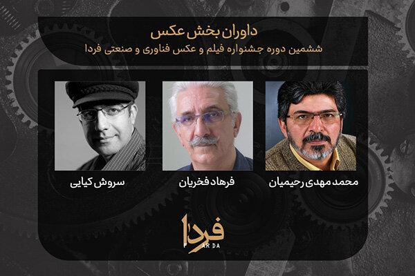 به گزارش گروه فرهنگی خبرگزاری دانشجو به نقل از روابط عمومی جشنواره فیلم و عکس فردا، محمدمهدی رحیمیان، فرهاد فخریان و سروش کیایی آثار دریافت شده توسط بخش عکس جشنواره فردا را داوری و ارزیابی خواهند کرد.