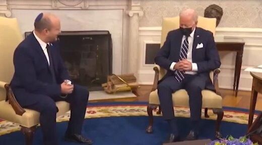 به نقل از خبرگزاری فلسطینی سما، شبکههای اجتماعی و رسانههای مختلف ویدئویی را از دیدار جو بایدن، رئیس جمهوری آمریکا و نفتالی بنت، نخستوزیر رژیم صهیونیستی که پس از دوبار تاخیر در نهایت به مدت ۲۵ دقیقه برگزار شد، منتشر کردند که نشان میدهد بایدن میان صحبتهای بنت درحال چرت زدن است.