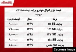 بر اساس جدول روزانه قیمت انواع کالاها که وبسایت اقتصادآنلاین منتشر میکند، قیمت پراید ۱۱۱ در روز چهارشنبه ۱۵ مرداد به ۹۰ میلیون تومان رسید و قیمت پراید ۱۵۱ پلاس ۱۰۱ میلیون تومان اعلام شد.