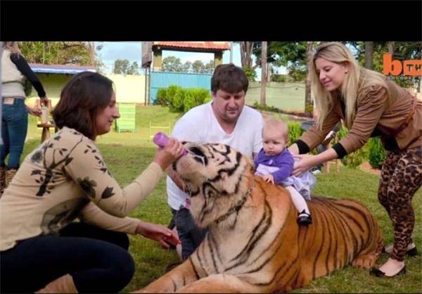 فارس: این خانواده ی برزیلی هفت بچه ببر و دو بچه شیر و یک بچه میمون را از نوزادی به خانه خود می آورند و چند سال است که با آنها به راحتی زندگی می کنند.