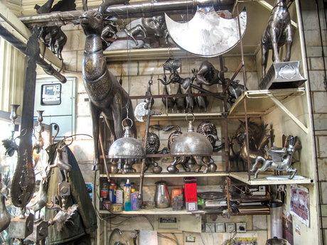 کمی پایینتر، پایینتر از میدان خراسان، «حاج علی گلمحمد» وسط یکعالمه قطعه ریز و درشت آهنی در کارگاهش مشغول است: ۶۹ سالمه، ۵۰ ساله کارم اینه.