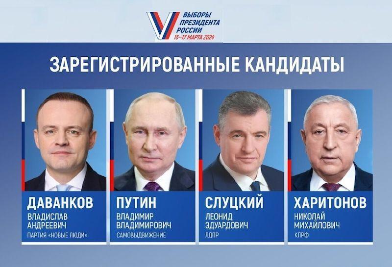 ولادیمیر پوتین (رئیسجمهوری کنونی)، نیکولای خاریتونوف (حزب کمونیست)، ولادیسلاو داوانکوف (حزب مردم جدید) و لئونید اسلوتسکی (حزب لیبرال دموکراسی) روسیه نامزدهای انتخابات ریاستجمهوری این کشور هستند.