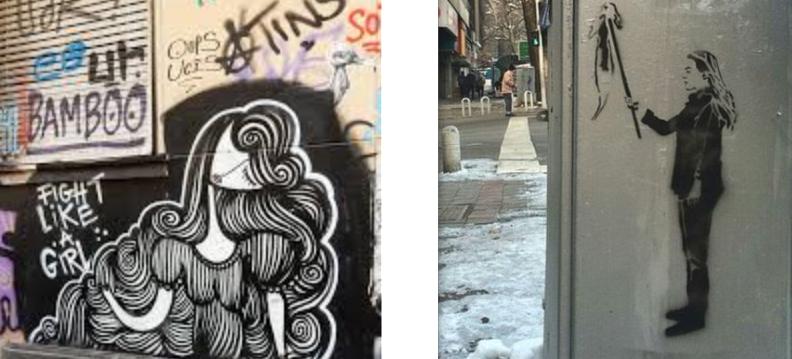 عکس دست چپ در بالا، کار یکی از هنرمندان گرافیتی معروف یونانی سونکه با عنوان «مانند یک دختر بجنگ» است. این اثر زیبا نه فقط در اتن بلکه در بسیاری از کشورهای دیگر نیز وجود دارد. با این حال آن حتی در اتن نیز موجب تغییر اساسی در گفتمان مردسالارانه حاکم در جامعه نمیگردد.
