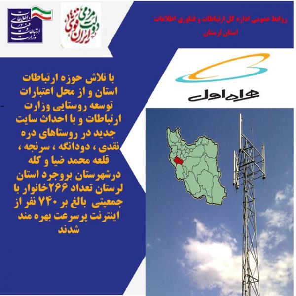 صارمی افزود: برای دسترسی ساکنین روستاهای دره نقدی، دوانگه، سرنجه، قلعه محمد ضیا، کله در شهرستان بروجرد با ۲۶۶ خانوار و جمعیتی بالغ بر ۷۴۰ نفر به اینترنت پرسرعت همراه، که از محل اعتبارات توسعه ارتباطات روستایی وزارت ارتباطات و فناوری اطلاعات توسط اپراتور همراه اول و مخابرات منطقه لرستان این سایت اجراء و به بهره برداری رسید.