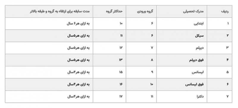 پنجم؛ حداکثر گروه شغلی قابل اعمال ۲۰ و طبقه شغلی قابل اعمال ۱۶ بوده و اگر افراد در این نوع گروه/طبقه شغلی قرار داشته باشند ارتقاء یک گروه/طبقه بالاتر برای آنان موضوعیت نداشته و اعمال نخواهد شد.