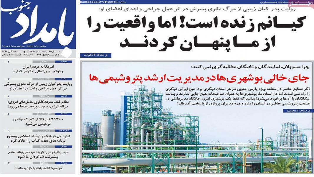صفحه نخست روزنامههای بوشهر را در ۱۹ آبان ۹۹ اینجا بخوانید.